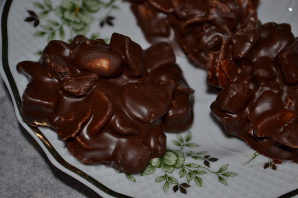 A csokit gőz felett megolvasztom, az összes hozzávalót belekeverem, vékonyan olajozott alufóliára halmokat készítek. Dermedés után fogyasztható.