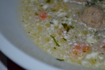 A hús alaplevet felteszem főni a zöldségekkel, ha már félig megpuhultak, kis gombócokat formálok az ízesített darálthúsból ,majd a kockára vágott piros kaliforniai paprikával együtt a levesbe teszem, 1-2 kanál olíva olajjal meglocsolom, további 15 percet főzöm. A végén tárkonyecettel picit megsavanyítom, kevés tejföllel ízesítem, tetejét megszórom vágott petrezselyemmel.